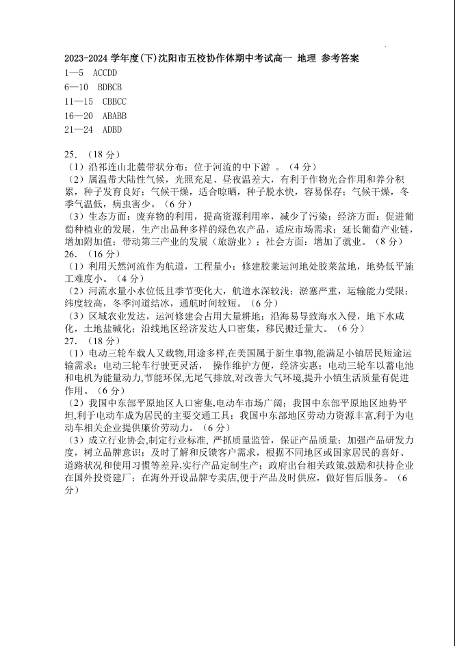 辽宁省沈阳市省重点中学五校联考2023-2024学年高一下学期5月期中考试地理答案