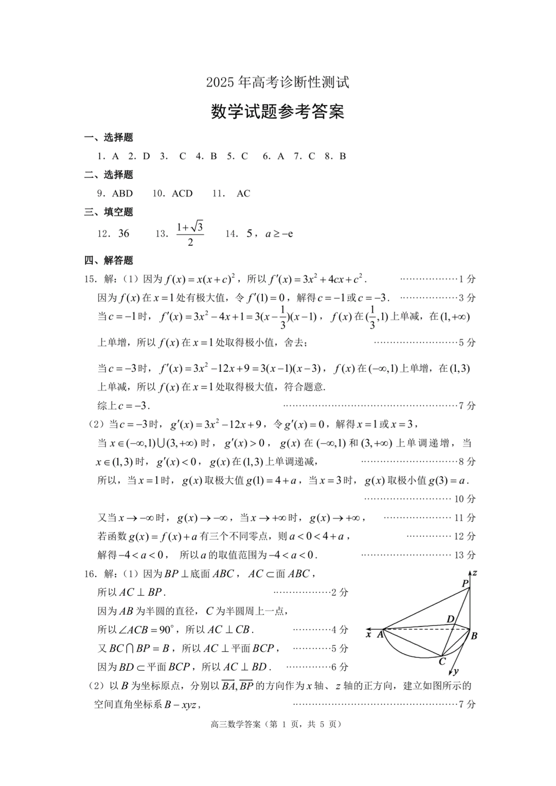 山东省烟台市2024-2025学年下学期3月高三诊断性测试(一模)数学答案