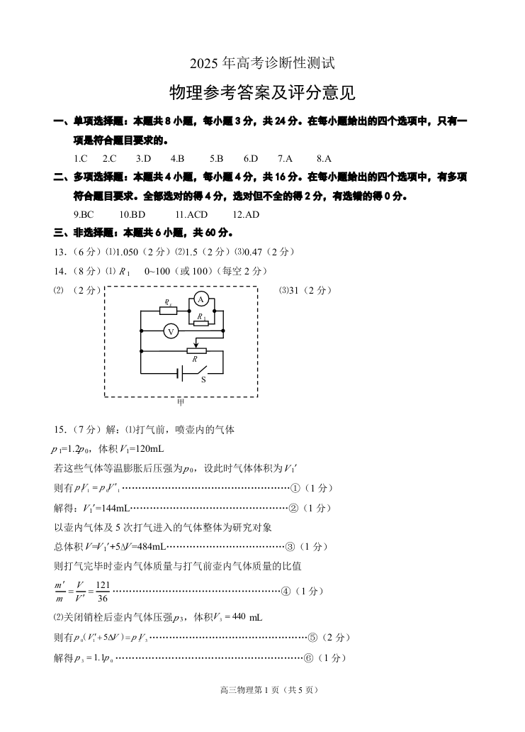 山东省烟台市2024-2025学年下学期3月高三诊断性测试(一模)物理答案