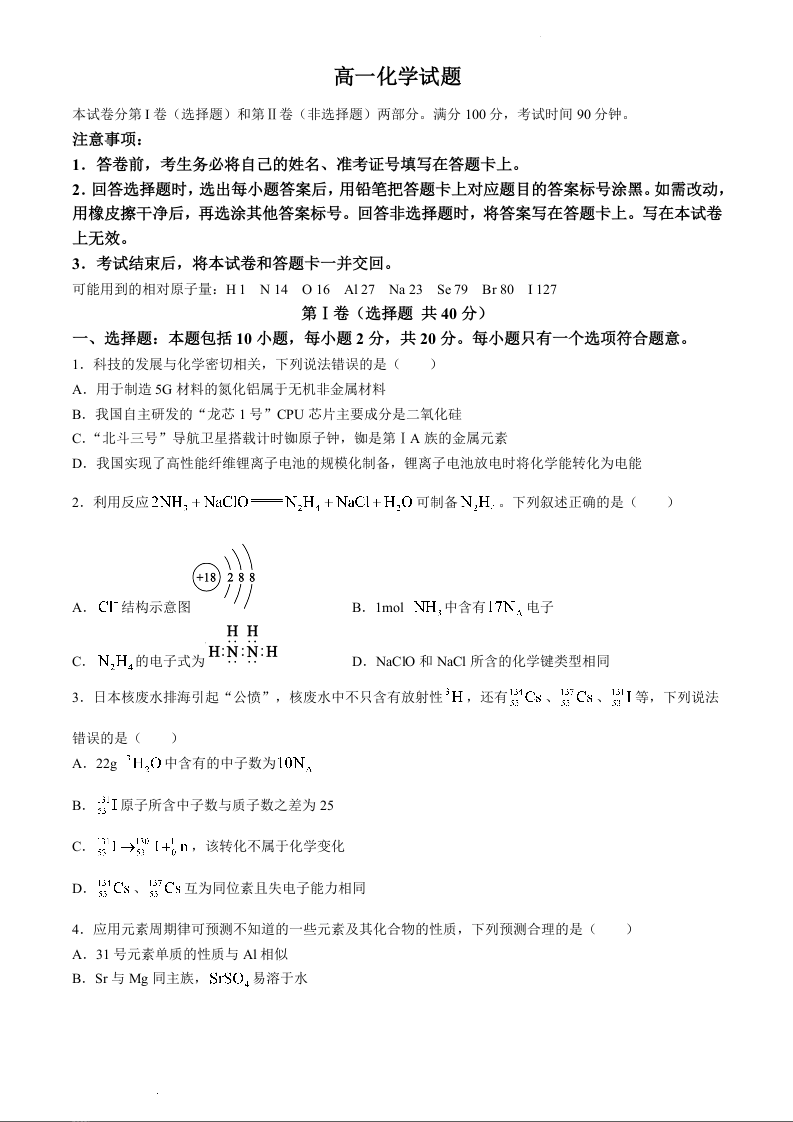 山东省德州市2023-2024学年高一下学期期中考试化学