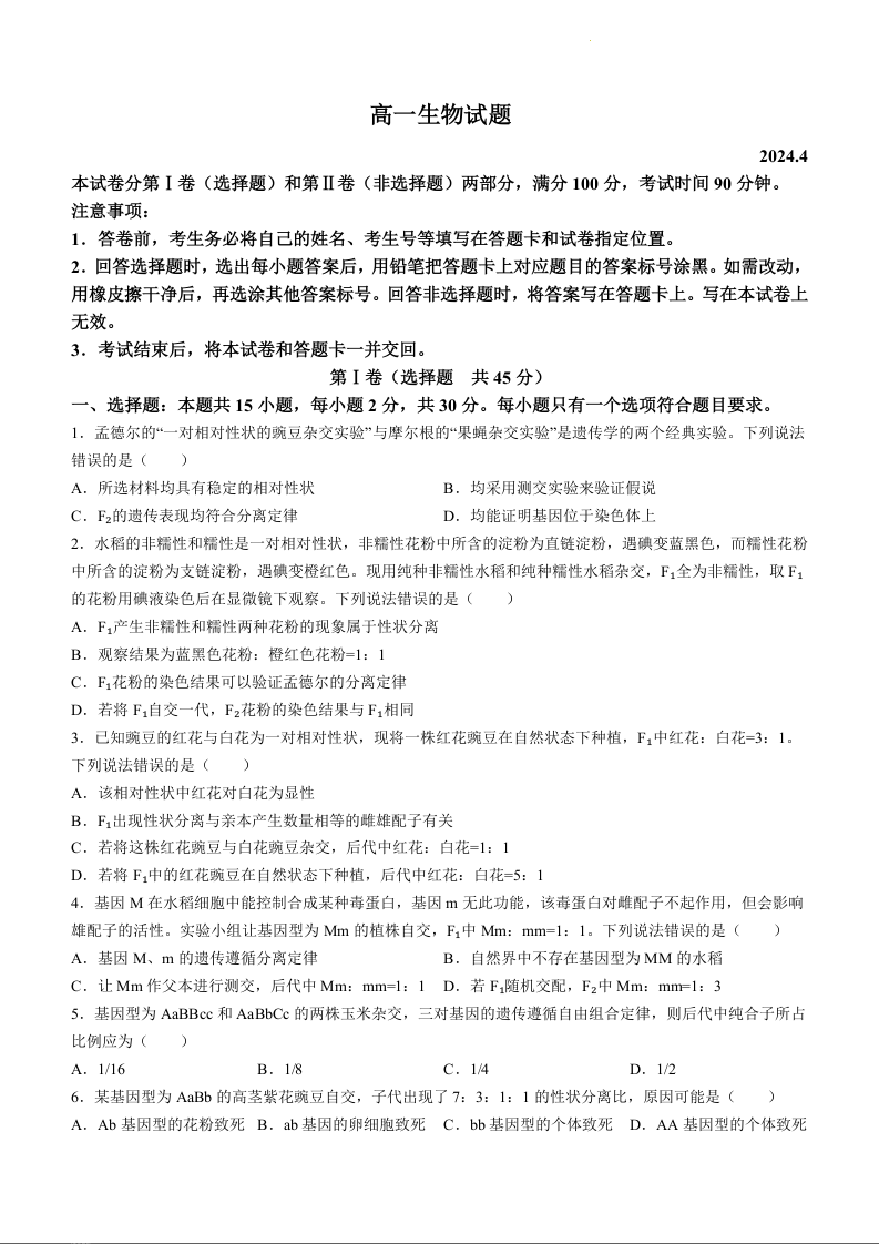 山东省德州市2023-2024学年高一下学期4月期中考试生物