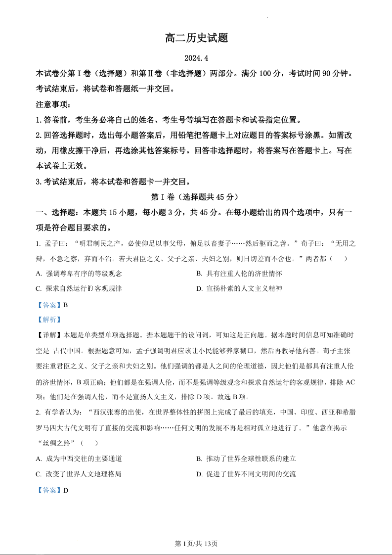 山东省德州市2023-2024学年高一下学期期中考试历史(精品解析版)