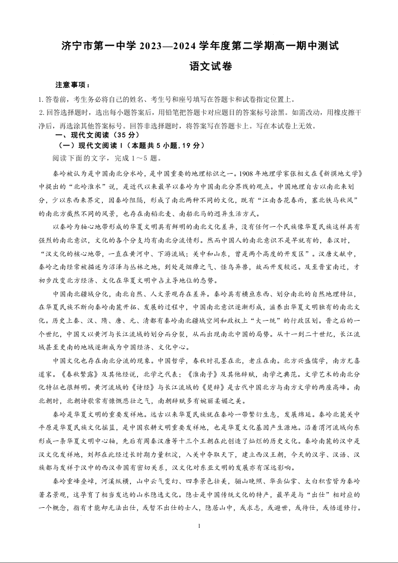 山东省济宁市第一中学2023-2024学年高一下学期5月期中测试语文
