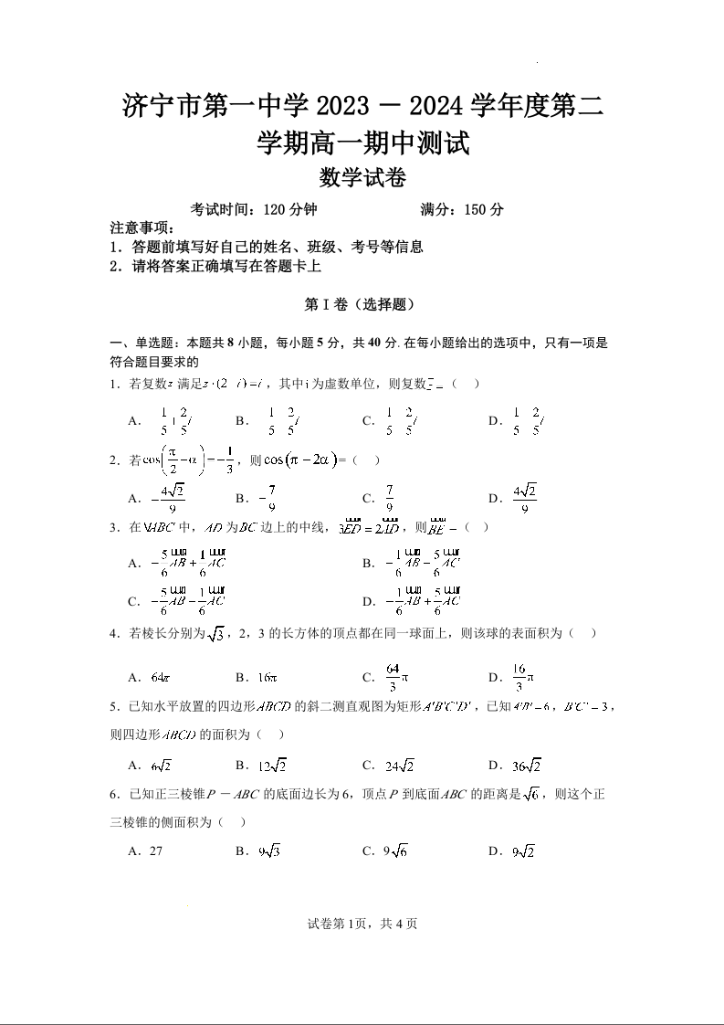 山东省济宁市第一中学2023-2024学年高一下学期5月期中测试数学