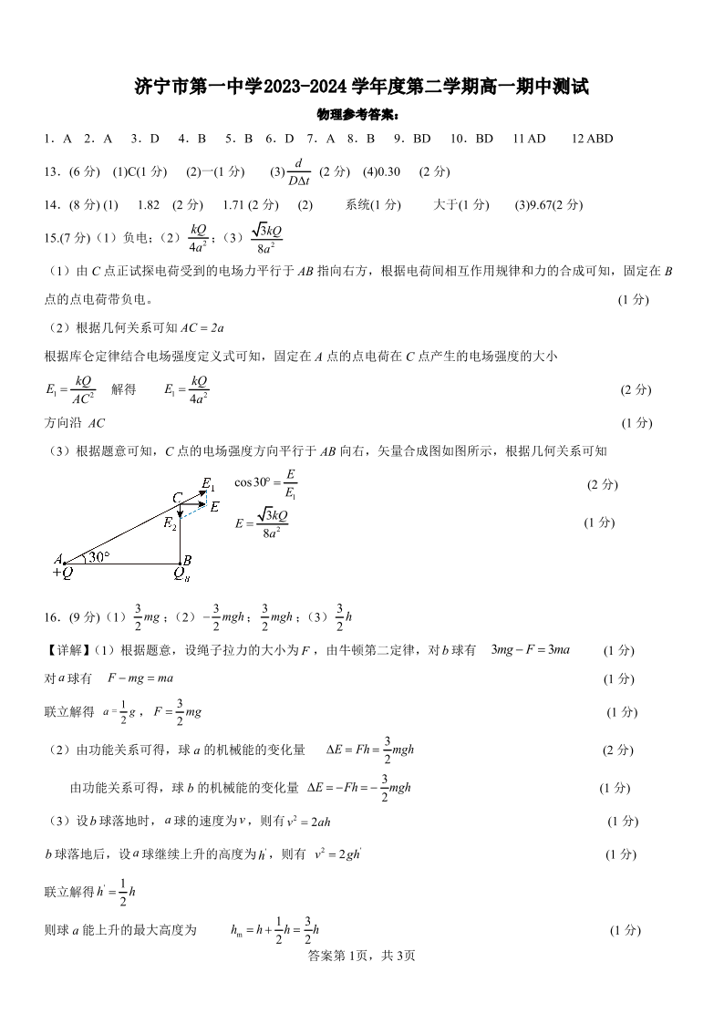 山东省济宁市第一中学2023-2024学年高一下学期5月期中测试物理答案