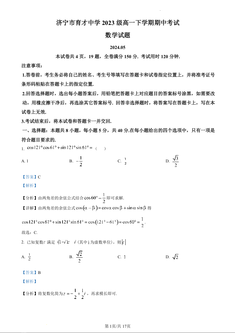 山东省济宁市育才中学2023-2024学年高一下学期期中考试数学(精品解析版)