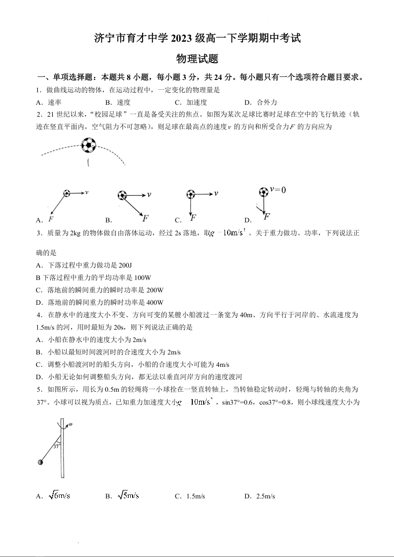 山东省济宁市育才中学2023-2024学年高一下学期期中考试物理