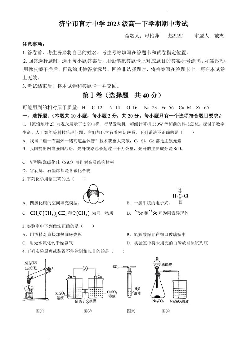 山东省济宁市育才中学2023-2024学年高一下学期期中考试化学