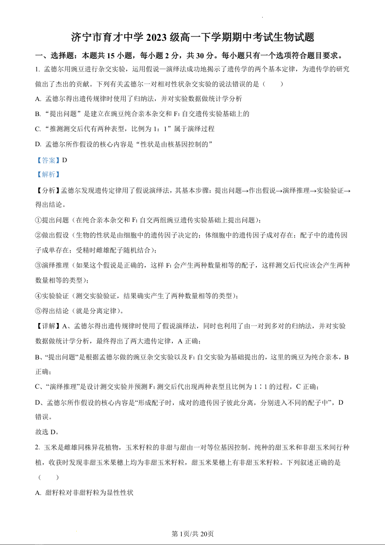 山东省济宁市育才中学2023-2024学年高一下学期期中考试生物(精品解析版)