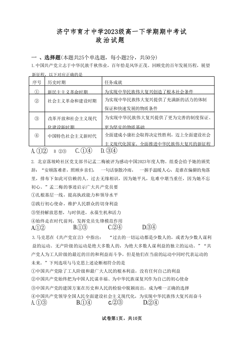 山东省济宁市育才中学2023-2024学年高一下学期期中考试政治