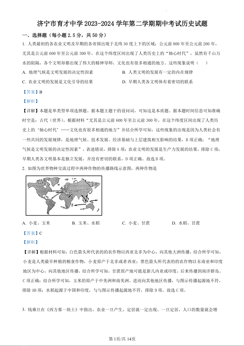 山东省济宁市育才中学2023-2024学年高一下学期期中考试历史(精品解析版)