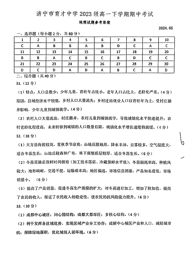 山东省济宁市育才中学2023-2024学年高一下学期期中考试地理答案