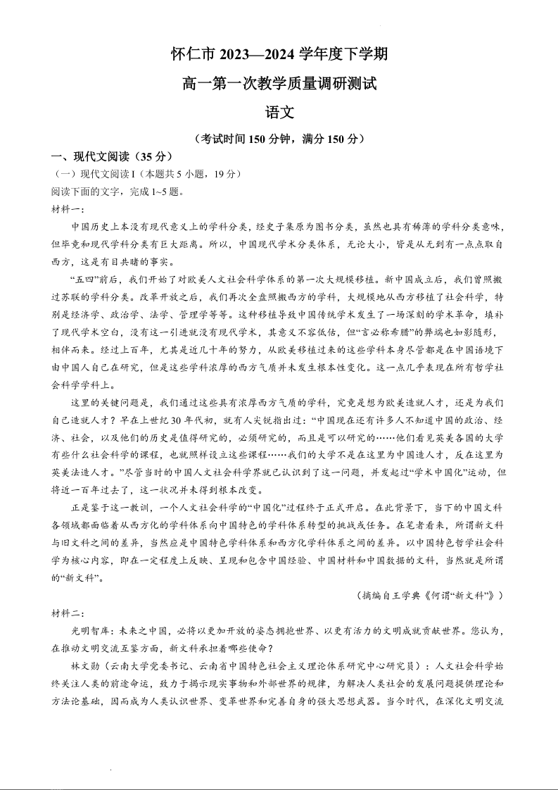 山西省怀仁市2023-2024学年高一下学期第一次教学质量调研考试语文+答案