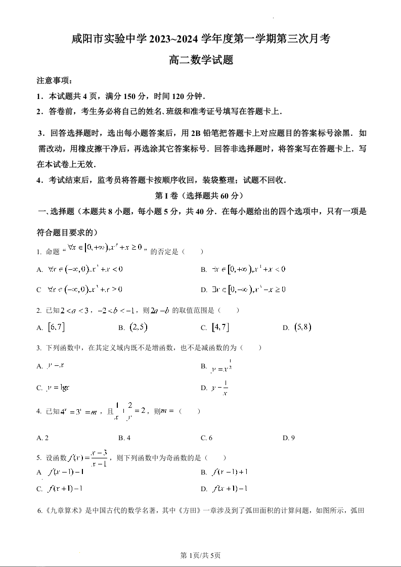 陕西省咸阳市实验中学2023-2024学年高一上学期段性检测数学(原卷版)