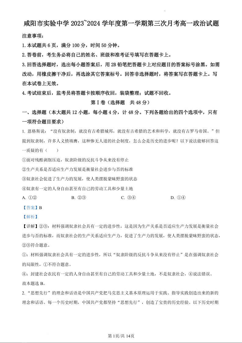 陕西省咸阳市实验中学2023-2024学年高一上学期段性检测政治(精品解析版)