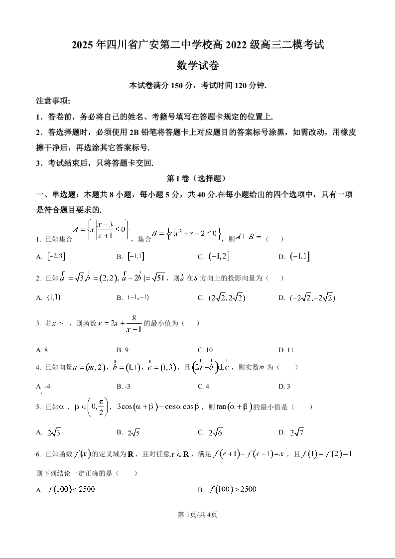 四川省广安第二中学校2025届高三下学期二模试题数学(原卷版)