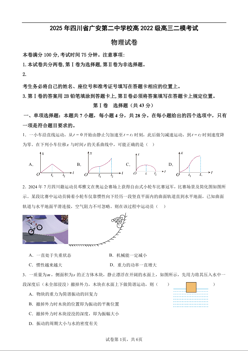 四川省广安第二中学校2025届高三下学期二模试题物理+答案