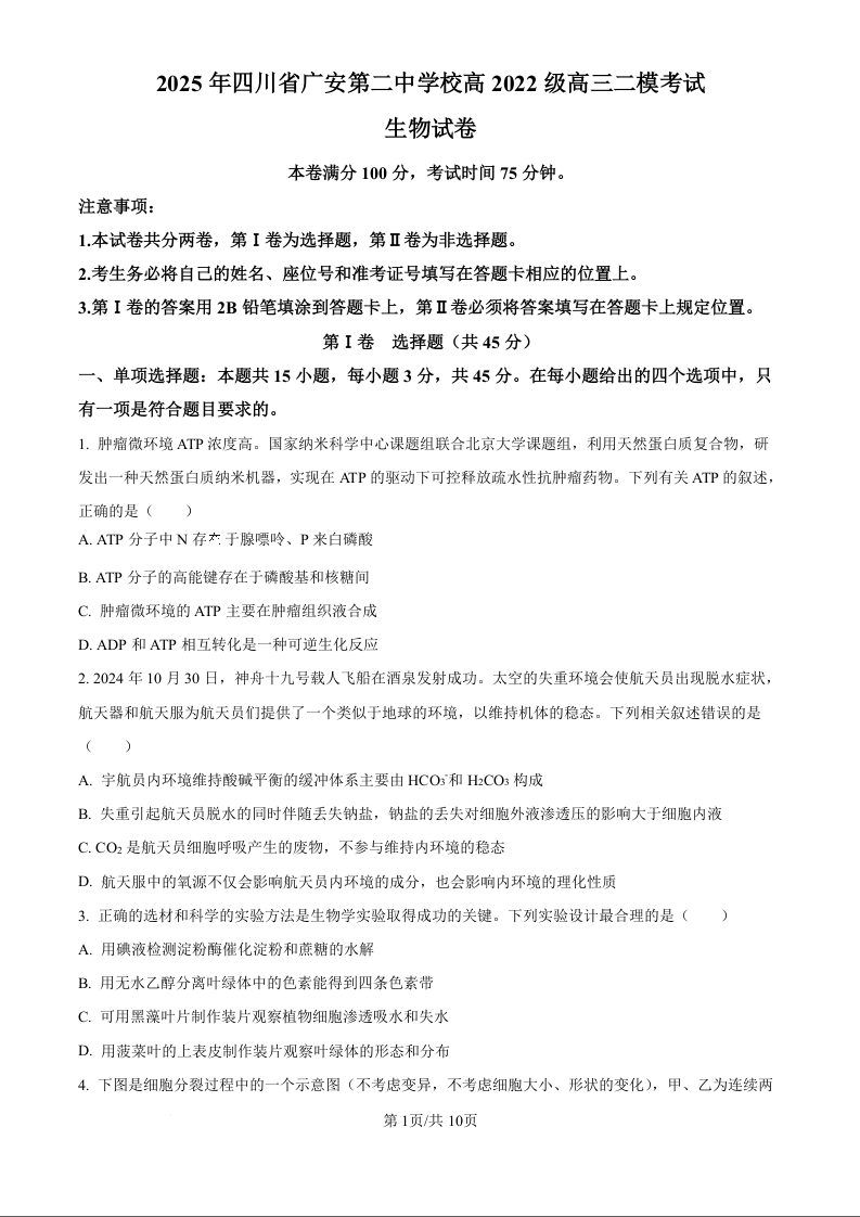 四川省广安第二中学校2025届高三下学期二模试题生物(原卷版)