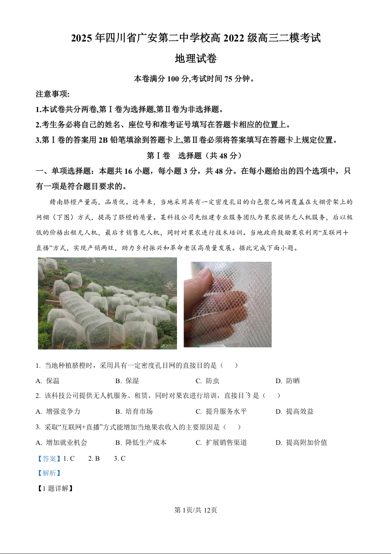 四川省广安第二中学校2025届高三下学期二模试题地理(精品解析版)