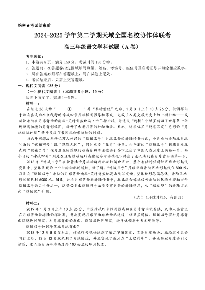 浙江省天域全国名校协作体2025届高三下学期3月月考语文