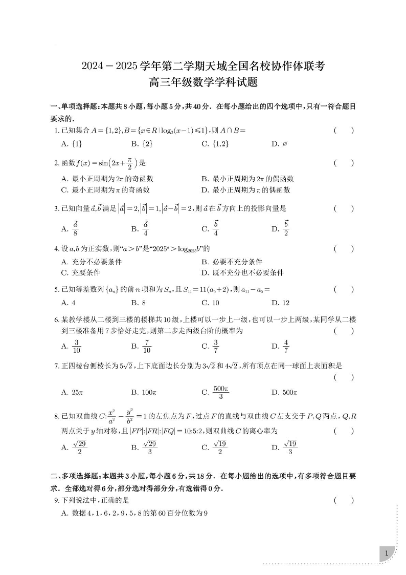 浙江省天域全国名校协作体2025届高三下学期3月月考数学
