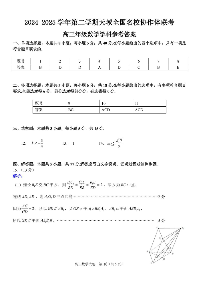 浙江省天域全国名校协作体2025届高三下学期3月月考数学答案