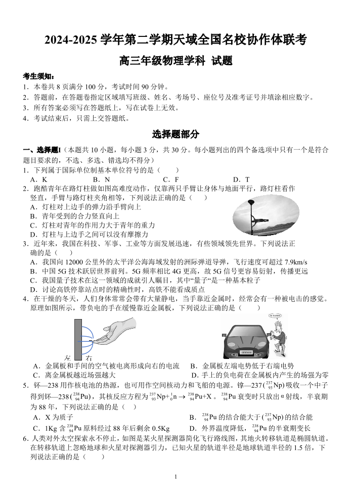 浙江省天域全国名校协作体2025届高三下学期3月月考物理