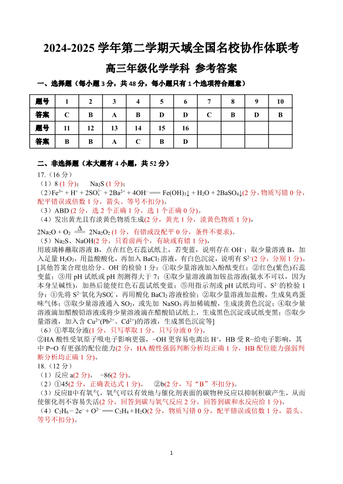 浙江省天域全国名校协作体2025届高三下学期3月月考化学答案