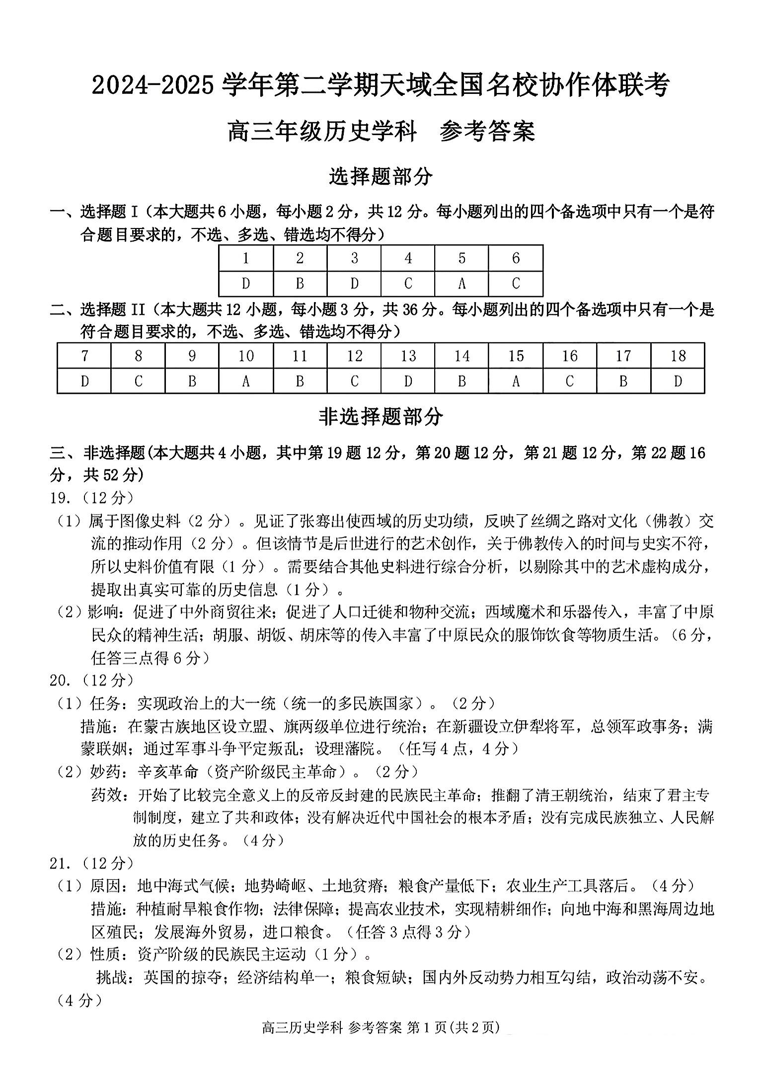浙江省天域全国名校协作体2025届高三下学期3月月考历史答案