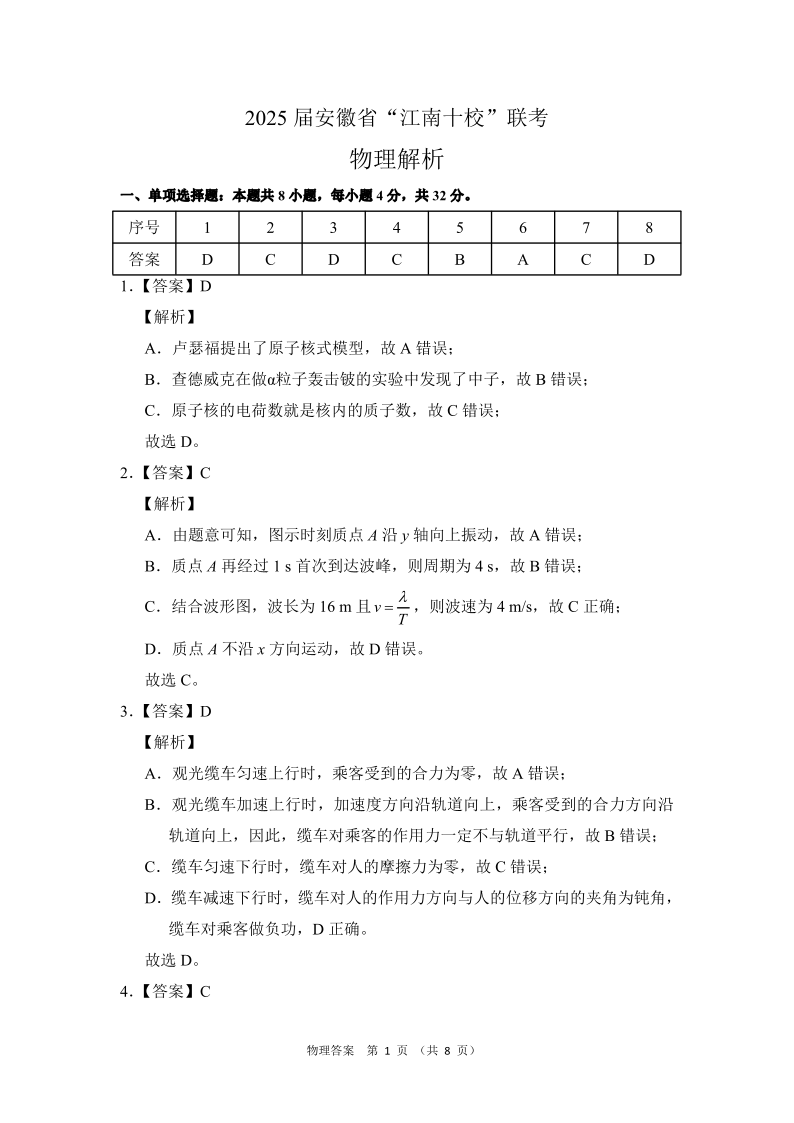 安徽省江南十校2025届高三下学期第一次联考物理答案