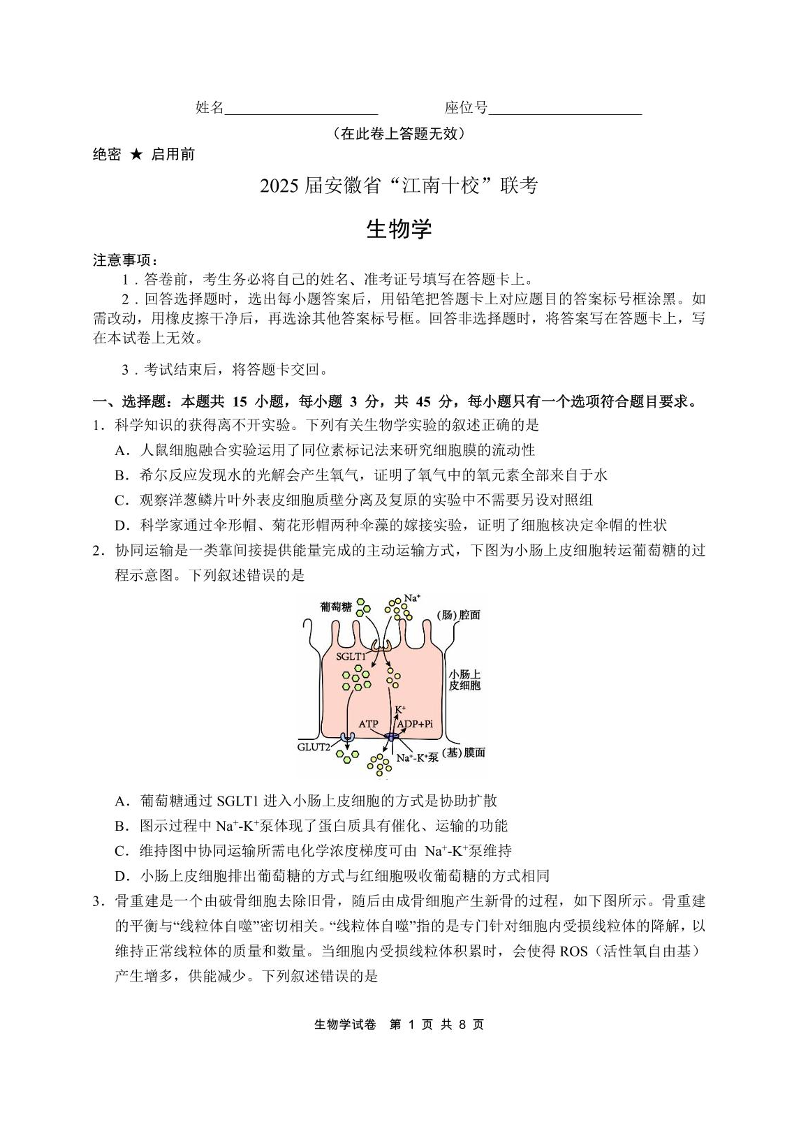安徽省江南十校2025届高三下学期第一次联考生物+答案