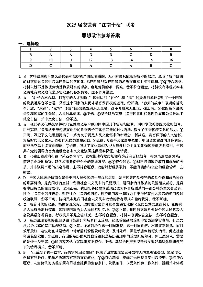 安徽省江南十校2025届高三下学期第一次联考政治答案