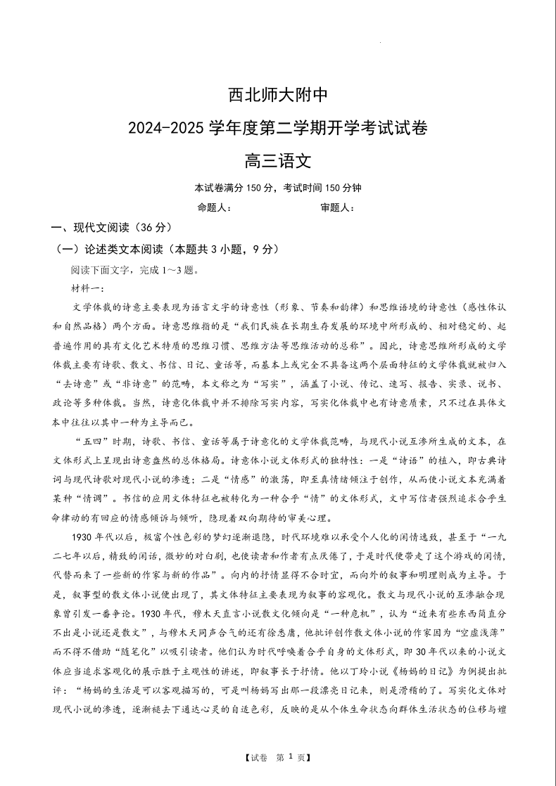 甘肃省西北师范大学附属中学2025届高三下学期开学考试语文