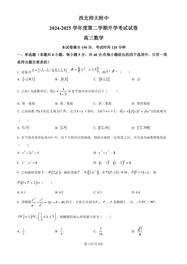 甘肃省西北师范大学附属中学2025届高三下学期开学考试数学(原卷版)