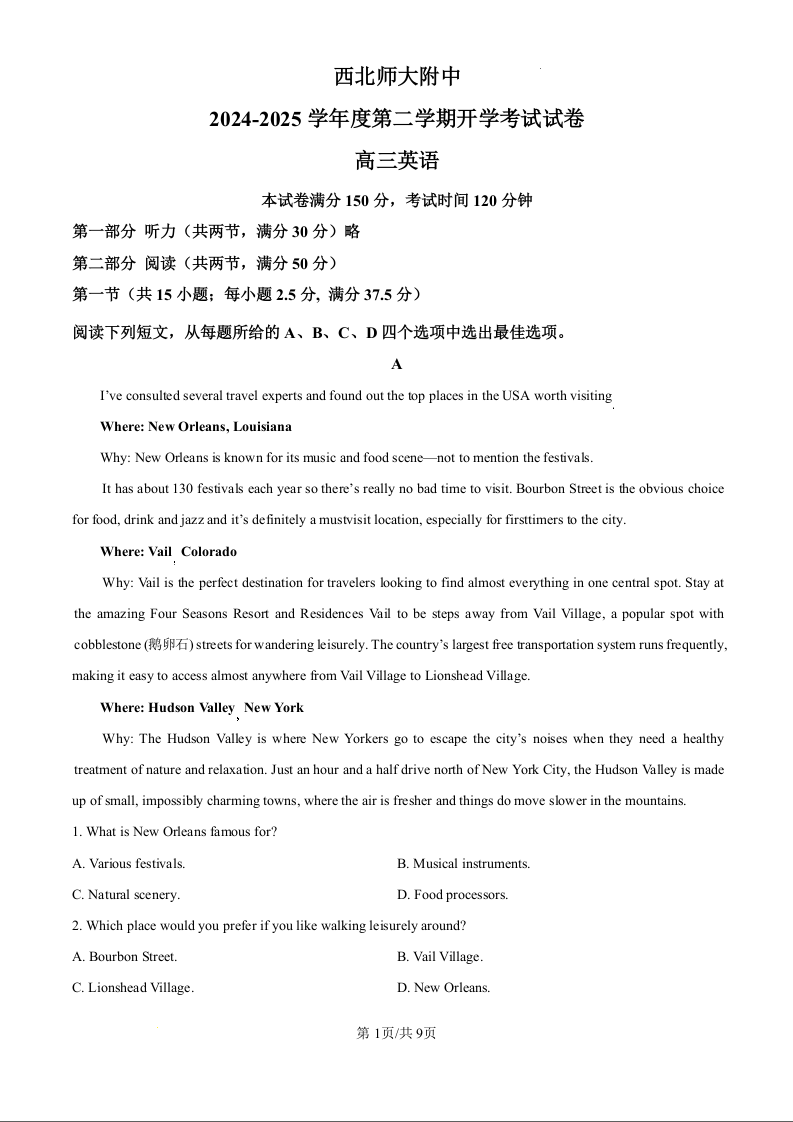 甘肃省西北师范大学附属中学2025届高三下学期开学考试英语(原卷版)