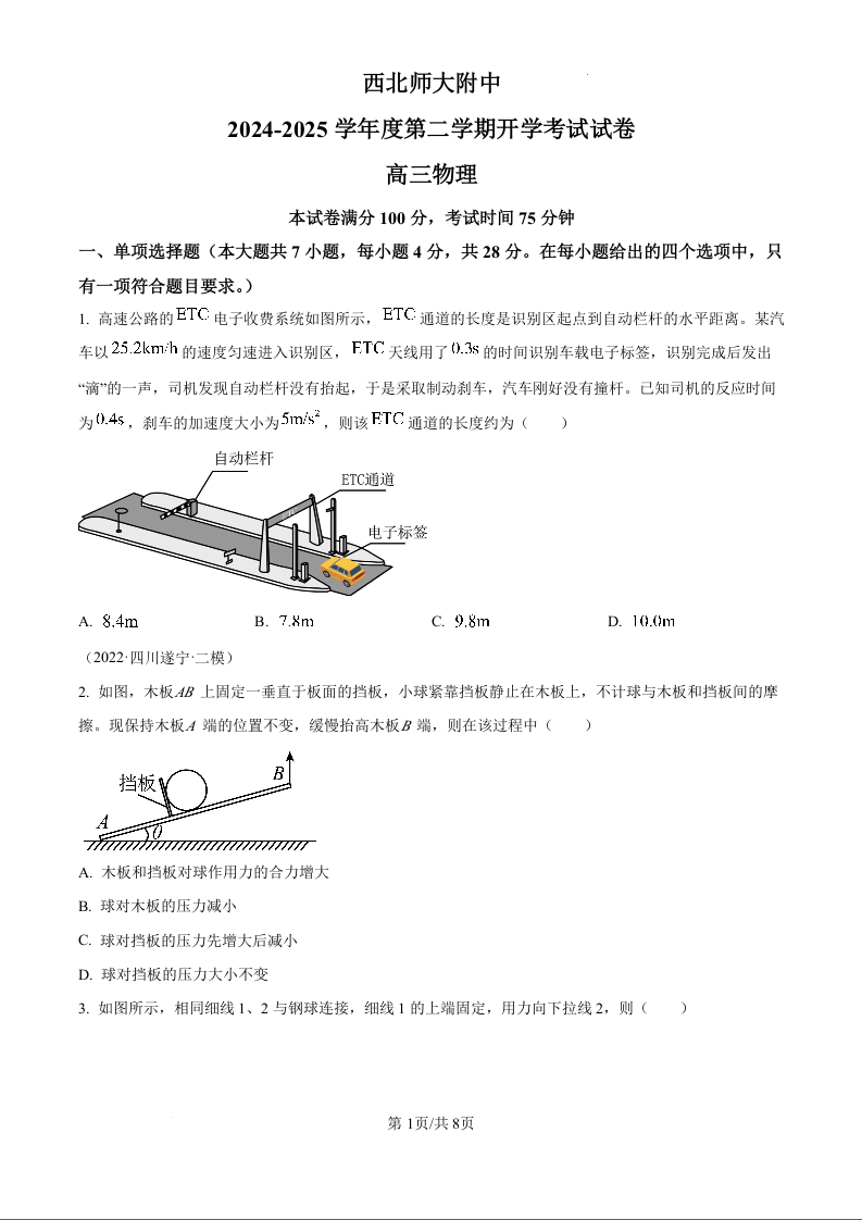 甘肃省西北师范大学附属中学2025届高三下学期开学考试物理(原卷版)