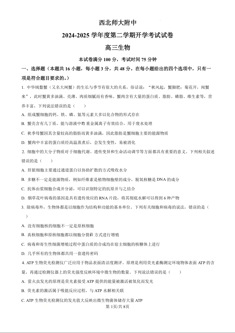 甘肃省西北师范大学附属中学2025届高三下学期开学考试生物(原卷版)