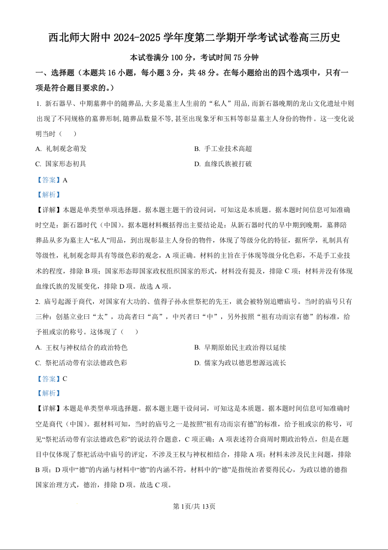 甘肃省西北师范大学附属中学2025届高三下学期开学考试历史(精品解析版)