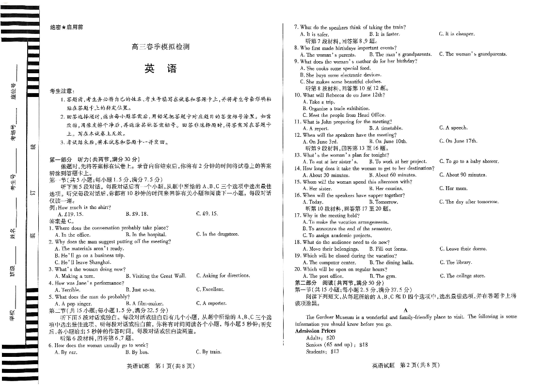河南省天一大联考2025届高三3月春季模拟检测英语