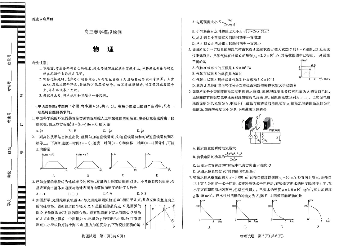 河南省天一大联考2025届高三3月春季模拟检测物理