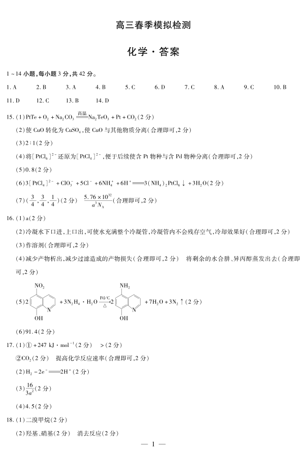 河南省天一大联考2025届高三3月春季模拟检测化学答案