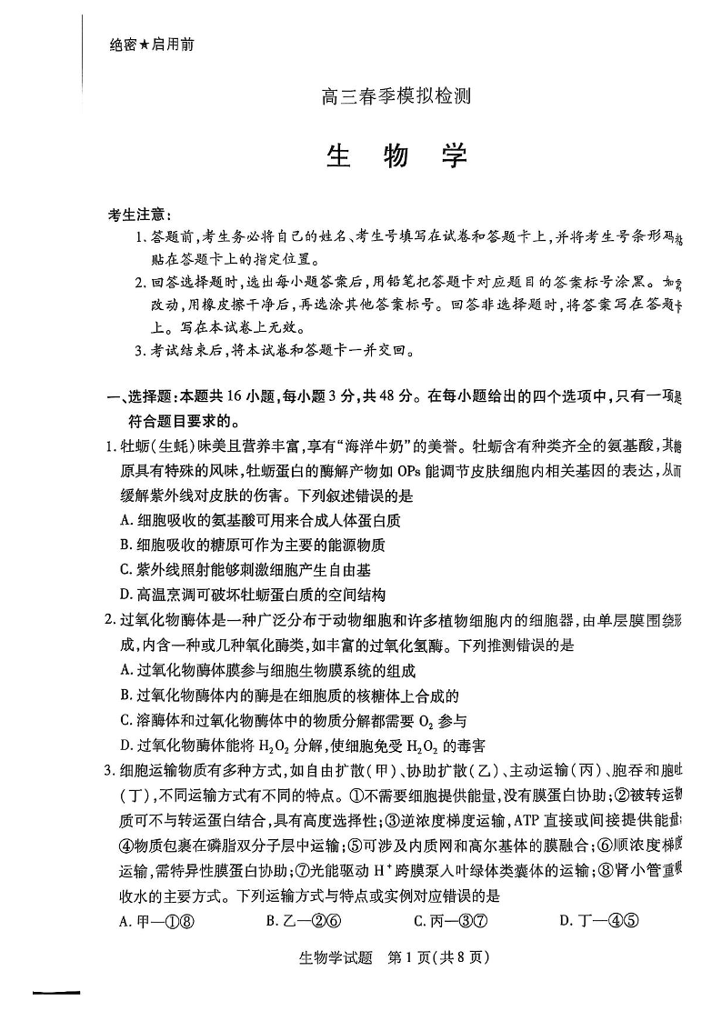 河南省天一大联考2025届高三3月春季模拟检测生物+答案