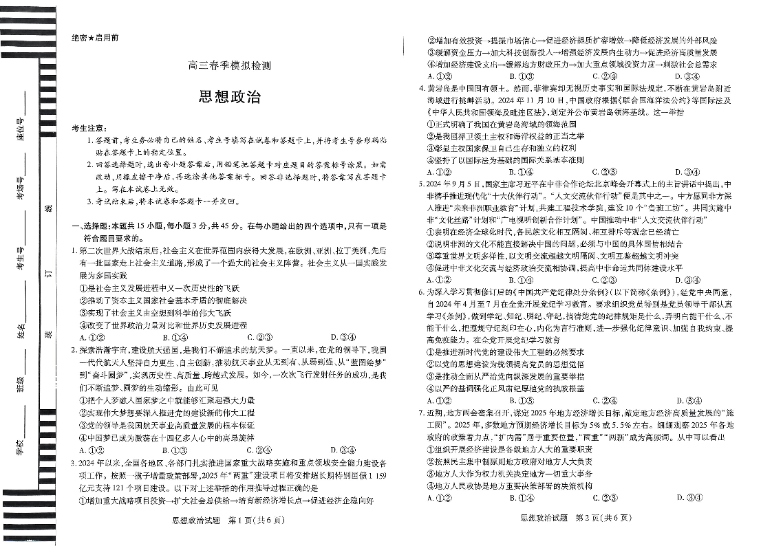 河南省天一大联考2025届高三3月春季模拟检测政治