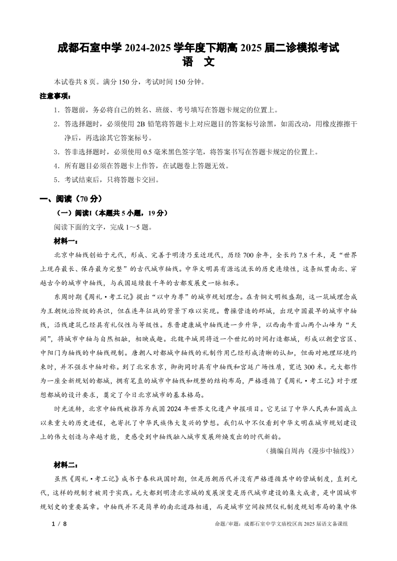 四川省成都石室中学2025届高三下期二诊模拟考试语文