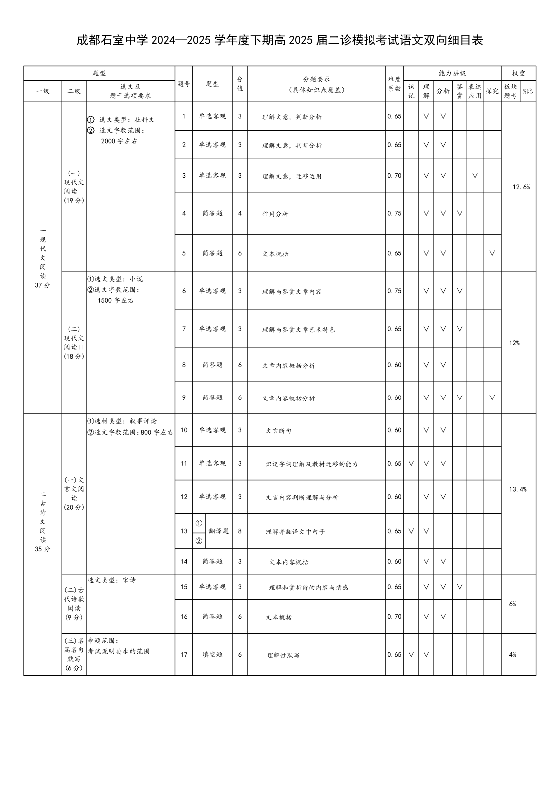 四川省成都石室中学2025届高三下期二诊模拟考试语文双向细目表