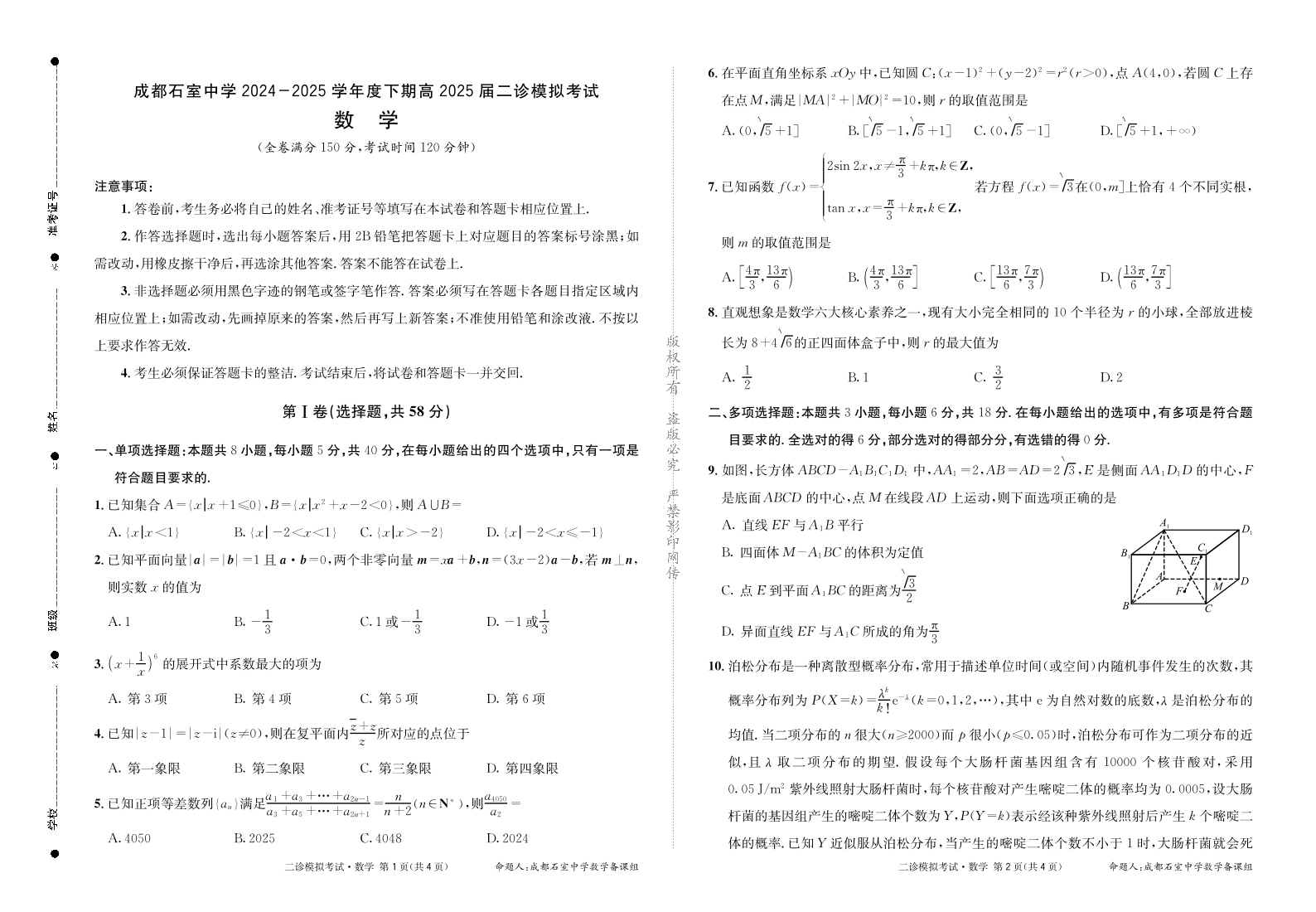 四川省成都石室中学2025届高三下期二诊模拟考试数学
