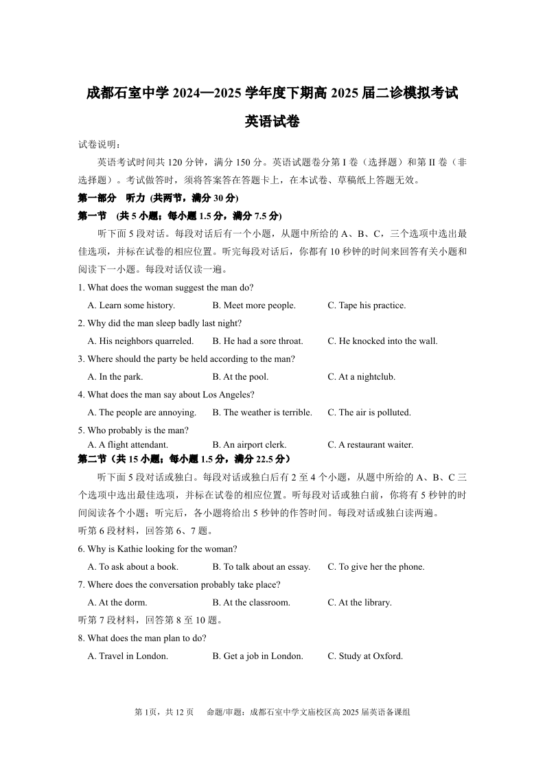 四川省成都石室中学2025届高三下期二诊模拟考试英语