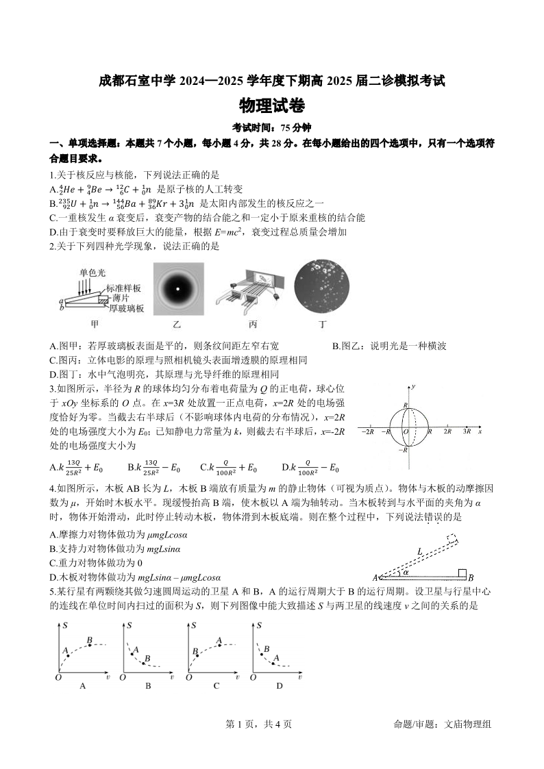 四川省成都石室中学2025届高三下期二诊模拟考试物理