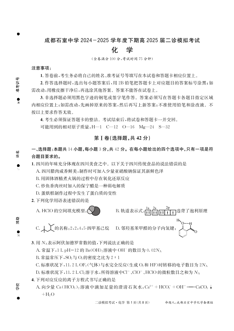 四川省成都石室中学2025届高三下期二诊模拟考试化学