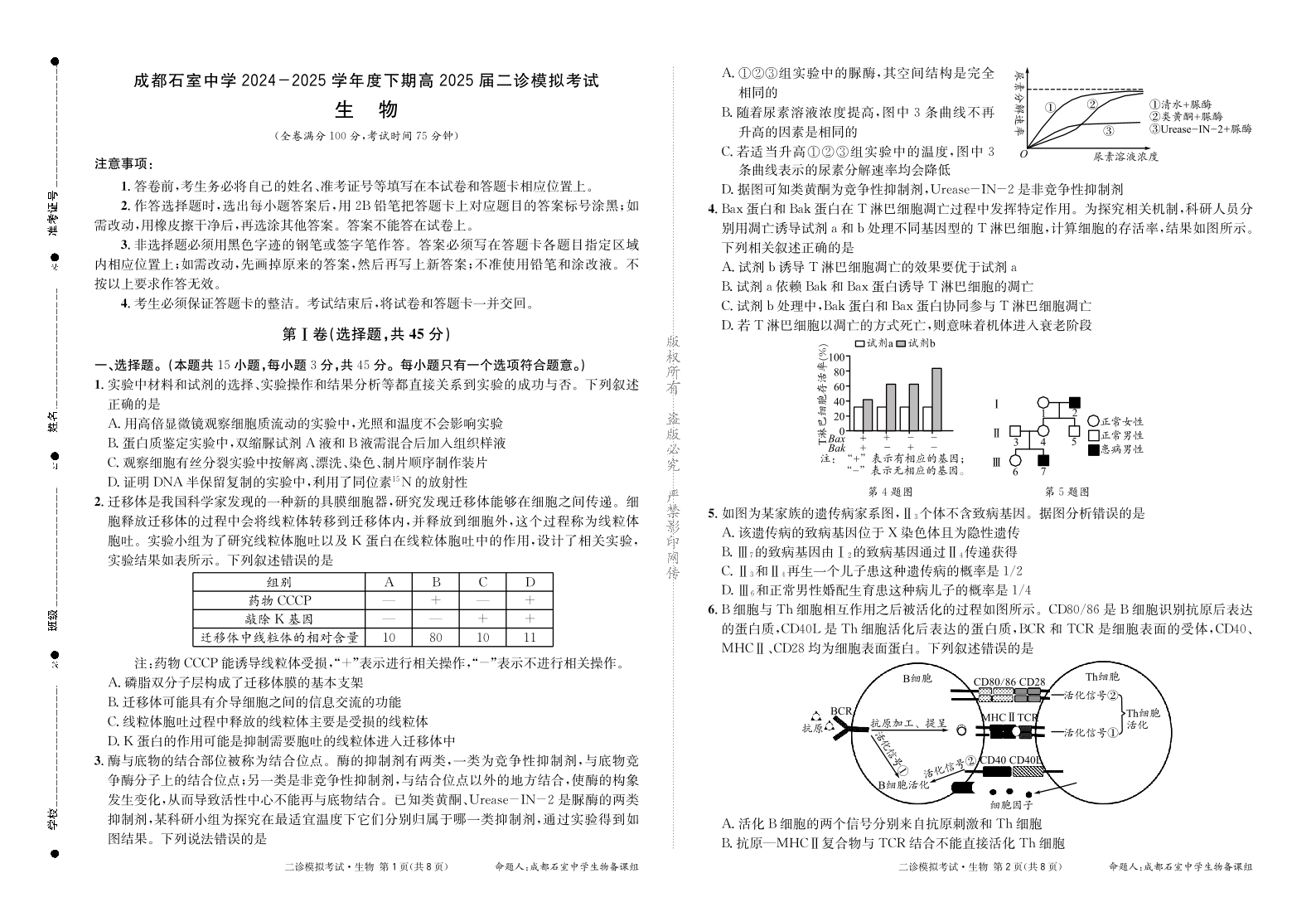 四川省成都石室中学2025届高三下期二诊模拟考试生物